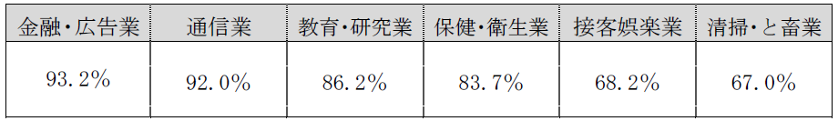 業種別でみるとデスクワークが中心である金融・広告業が93.2%、通信業が92.0%と高く、サービス業である清掃・と畜業は67.0%、接客娯楽業は68.2%となっています。