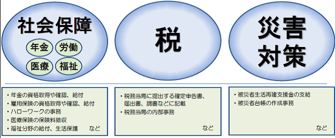 マイナンバーは、年金、雇用保険、医療保険の手続、生活保護や福祉の給付、確定申告などの税の手続など、法律で定められた事務に限って利用されます。