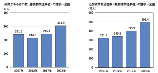 有業者は6706万人で、前回調査の2017年に比べ85万人増加しました。一方、無業者は4313万人となり、163万人の減少です。また、非農林業従事者のうち、副業がある者の割合は4.8%の305万人となり、17年と比べて60万人増加しました。