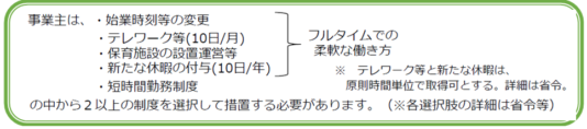 併せて、3歳に満たない子を養育する労働者がテレワークを選択できるように措置を講じることが、事業主に努力義務化されます。