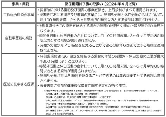 時間外労働の上限規制については、長時間労働の背景に業務の特性や取引慣行の課題があることから、時間外労働の上限についての適用が5年間猶予されていた「適用猶予事業・業務」も、2024年4月から一部特例つきで、時間外労働の上限規制が適用されることになります。