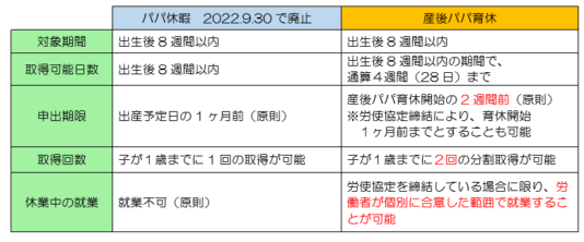 現在の「パパ休暇」制度は2022年9月30日で廃止され、新たな産後パパ育休制度が始まります。