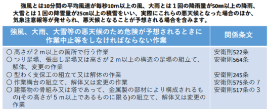 なお、建設業や林業、重機を使用して行う作業など、野外で作業を行う事業の場合は労働安全衛生法で、悪天候時の作業の中止について定めがあります。